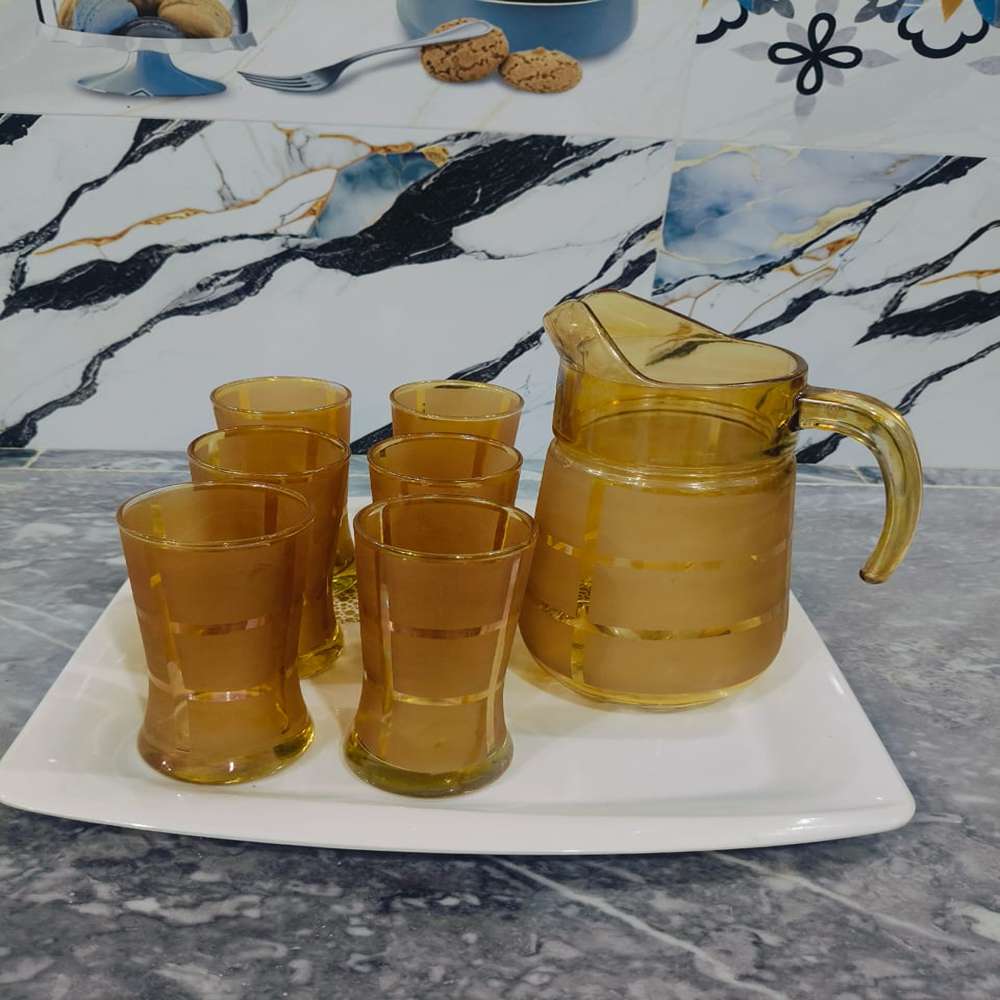 Bring timeless elegance to your dining or serving experience with the Golden Frosted Tall Glass Set with Pitcher. This luxurious drinkware collection is designed to add a touch of sophistication to any occasion—be it family dinners, festive gatherings, or casual tea times. Crafted with precision and beauty in mind, the set includes six tall glasses and one large pitcher, all featuring a golden frosted finish that radiates warmth and style.